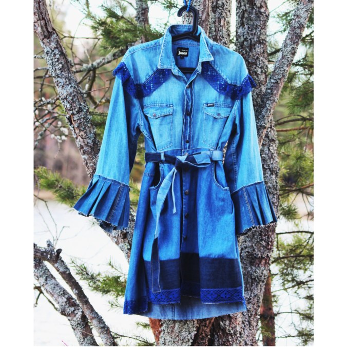Mekko on tehty vanhasta 80-luvun nahkatakista. Takin etuosa on nyt mekon takaosa, jättäen selän avoimeksi vyötärölle asti. Helmaan ompelin somisteeksi ns. “kalanpyrstön”. Kaulakorun materiaali on samaa nahkatakkia josta leikkasin suikaleita ja virkkasin ne yhteen. Tyyli on modernin puhdas mutta samalla rosoisen romanttinen.