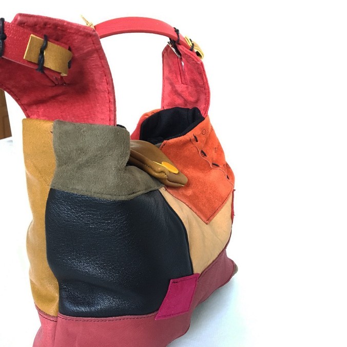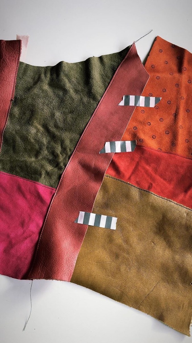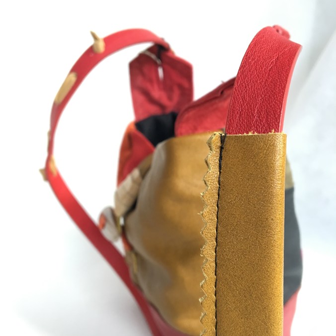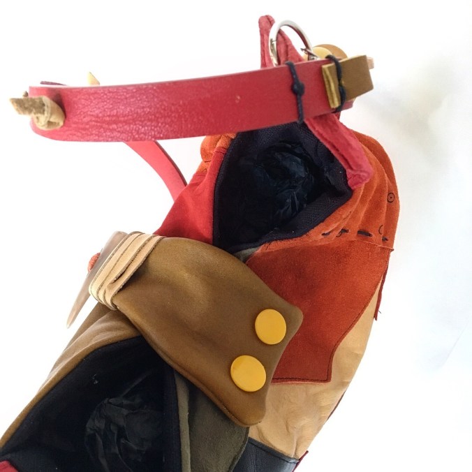 Mekko on tehty vanhasta 80-luvun nahkatakista. Takin etuosa on nyt mekon takaosa, jättäen selän avoimeksi vyötärölle asti. Helmaan ompelin somisteeksi ns. “kalanpyrstön”. Kaulakorun materiaali on samaa nahkatakkia josta leikkasin suikaleita ja virkkasin ne yhteen. Tyyli on modernin puhdas mutta samalla rosoisen romanttinen.