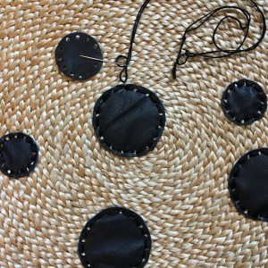 round leather decorations to a straw bag