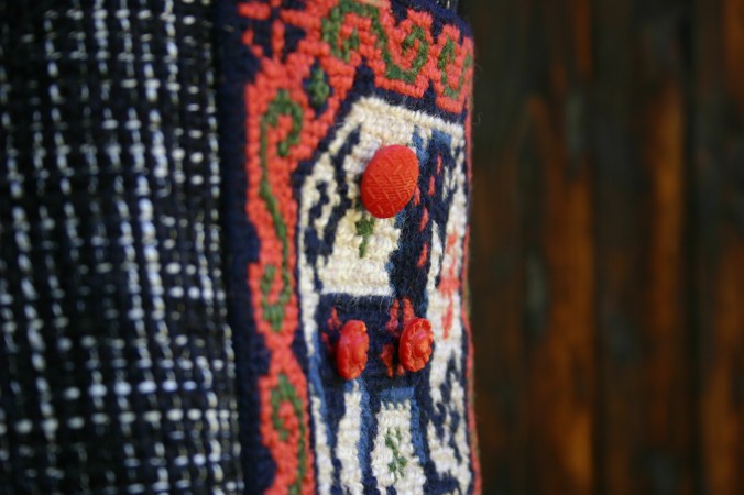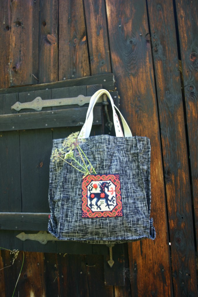 But as the project went on I wanted to do something extra, to give that unique touch to this bag also rather than leaving it just black. I found from my cross stitch stock this “dragon”. It´s almost ten years ago I bought it and now was the right moment for it. By placing it in the middle of the bag it serves also as a pocket. Buttons are vintage too, red ones to boost up the red from the cross stitch.